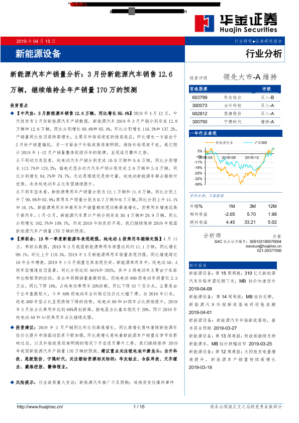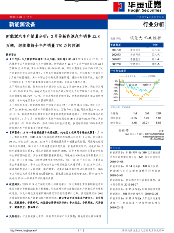 【华金证券】【20190415】新能源汽车产销量分析:3月份新能源汽车销售12.6万辆,继续维持全年产销量170万的预测-15页