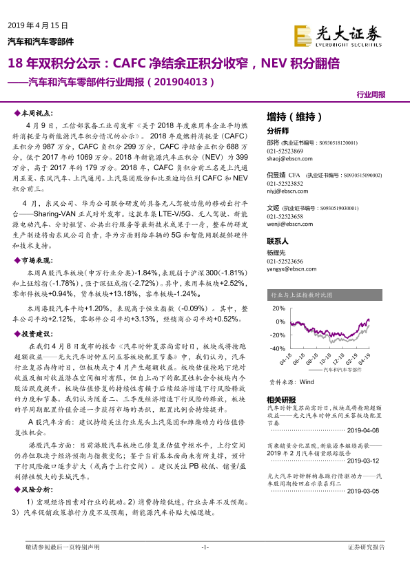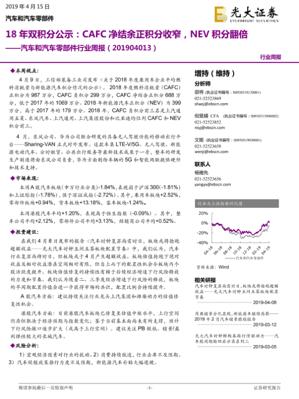【光大证券】【20190415】汽车和汽车零部件行业周报:18年双积分公示:CAFC净结余正积分收窄,NEV积分翻倍-16页