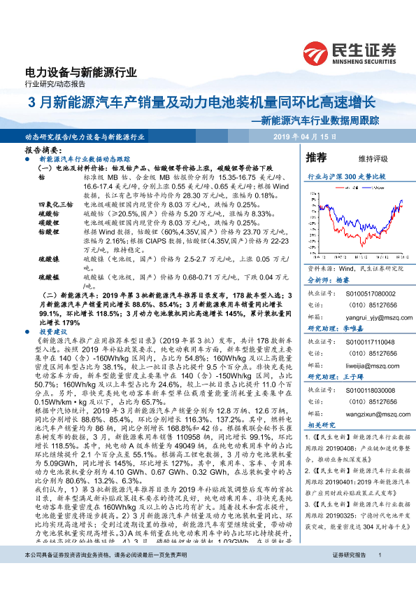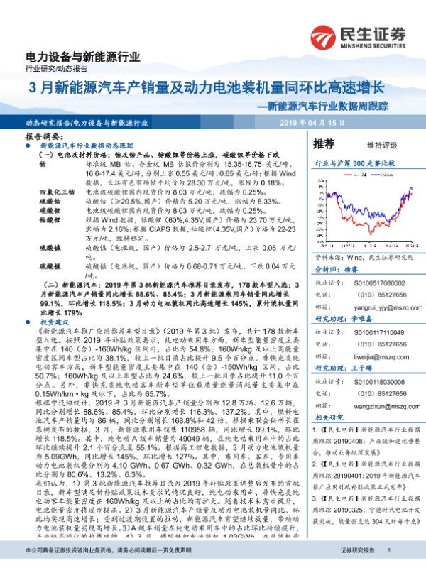【民生证券】【20190415】20190415-民生证券-新能源汽车行业数据周跟踪:3月新能源汽车产销量及动力电池装机量同环比高速增长-14页