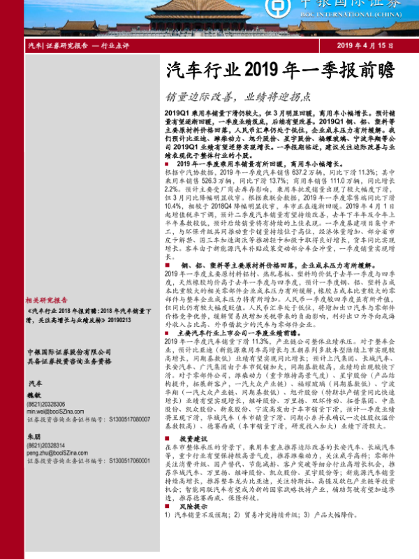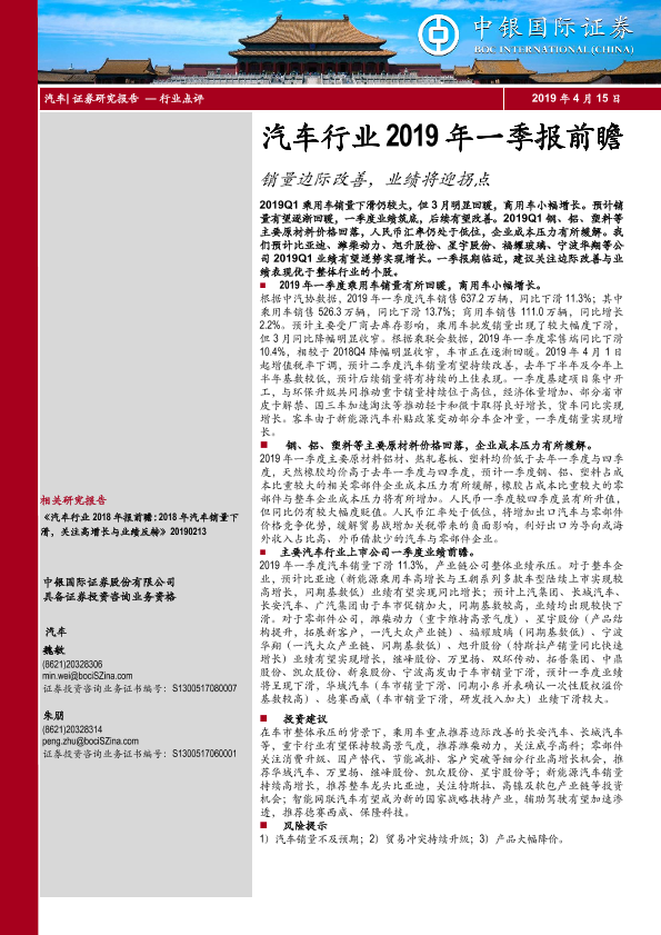 【中银证券】【20190415】汽车行业2019年一季报前瞻:销量边际改善,业绩将迎拐点-13页