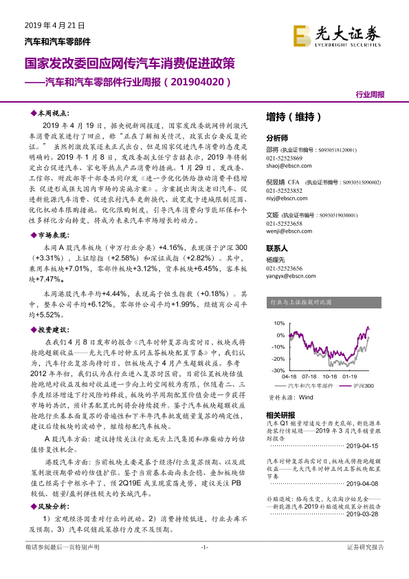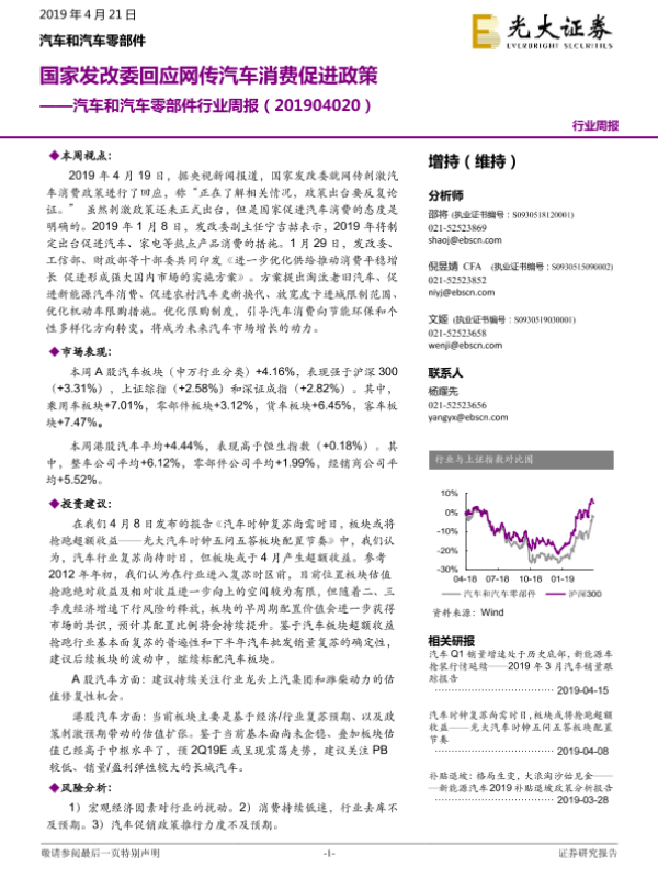 【光大证券】【20190421】汽车和汽车零部件行业周报:国家发改委回应网传汽车消费促进政策-15页