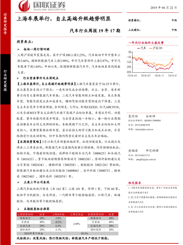 【国联证券】【20190422】20190422-国联证券-汽车行业周报19年17期:上海车展举行,自主高端升级趋势明显-18页