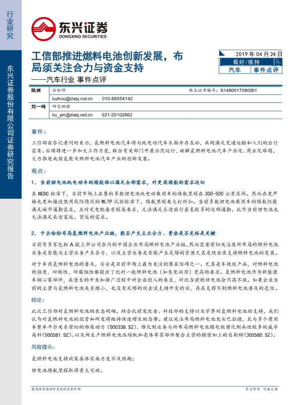 【东兴证券】【20190424】汽车行业事件点评:工信部推进燃料电池创新发展,布局须关注合力与资金支持-3页