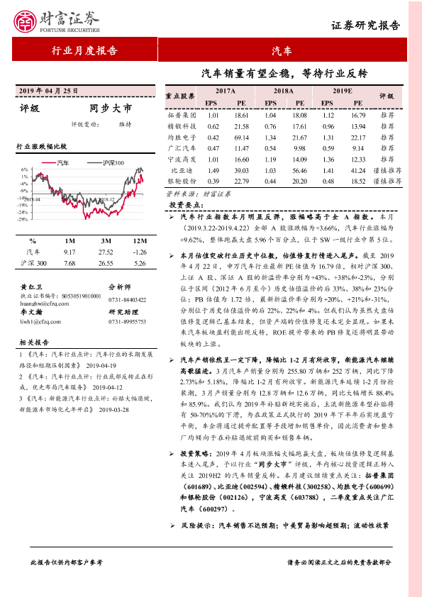 【财信证券】【20190425】20190425-财信证券-汽车行业行业月度报告:汽车销量有望企稳,等待行业反转-12页