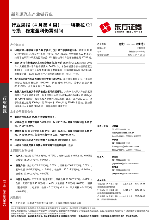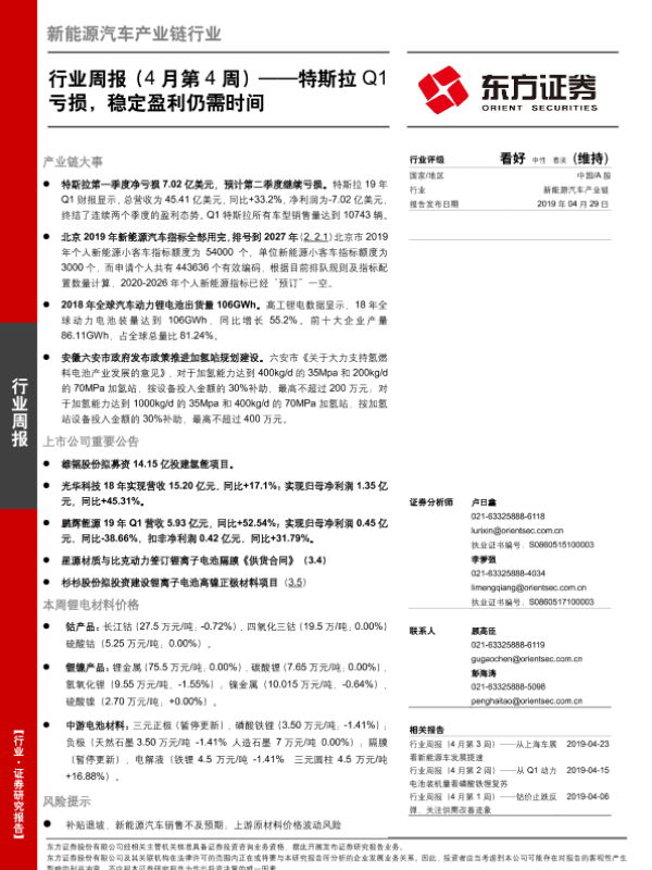 【东方证券】【20190429】新能源汽车产业链行业周报(4月第4周):特斯拉Q1亏损,稳定盈利仍需时间-24页