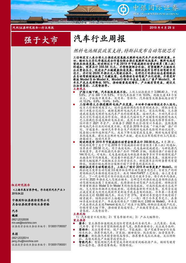 【中银证券】【20190429】20190429-中银证券-汽车行业周报:燃料电池频获政策支持,特斯拉发布自动驾驶芯片-18页
