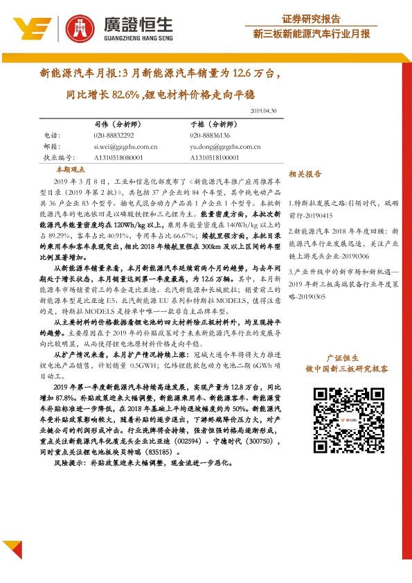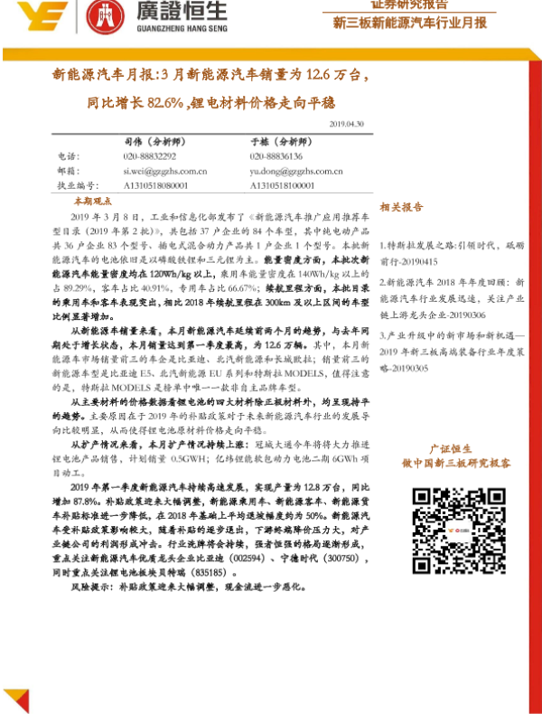 【广证恒生】【20190430】20190430-广证恒生证券研究所-新能源汽车月报:3月新能源汽车销量为12.6万台同比增长82.6%,锂电材料价格走向平稳-16页