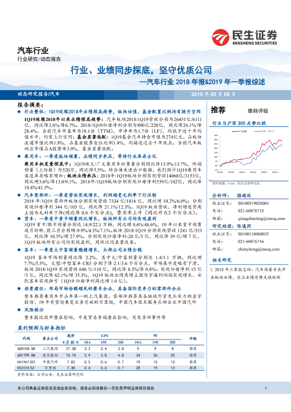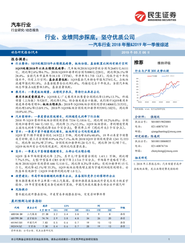 【民生证券】【20190506】汽车行业2018年报&2019年一季报综述:行业、业绩同步探底,坚守优质公司-28页