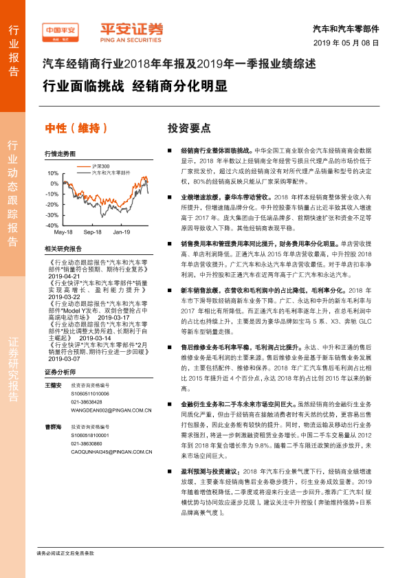 【平安证券】【20190508】汽车经销商行业2018年年报及2019年一季报业绩综述:行业面临挑战 经销商分化明显-18页