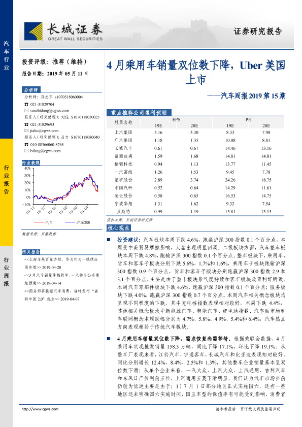 【长城证券】【20190511】汽车周报2019第15期:4月乘用车销量双位数下降,Uber美国上市-13页