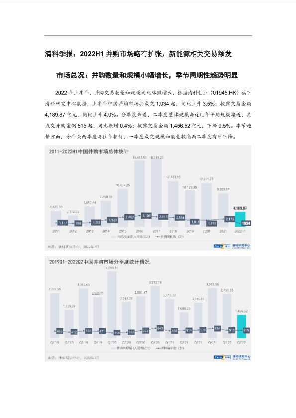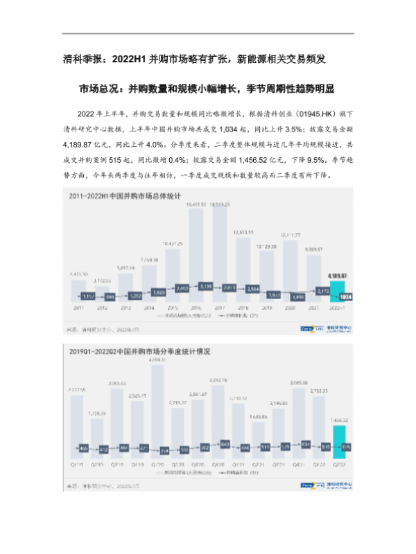 【清科研究中心】【20220630】清科季报:2022H1并购市场略有扩张,新能源相关交易频发-8页