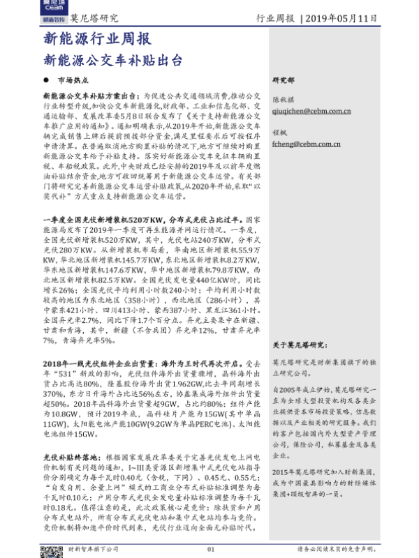 【莫尼塔研究】【20190511】20190511-莫尼塔投资-新能源行业周报:新能源公交车补贴出台-10页