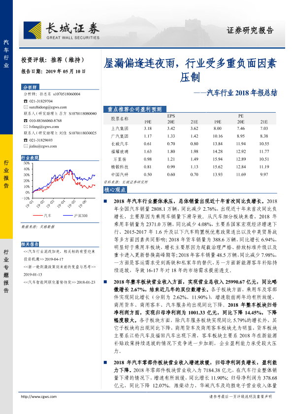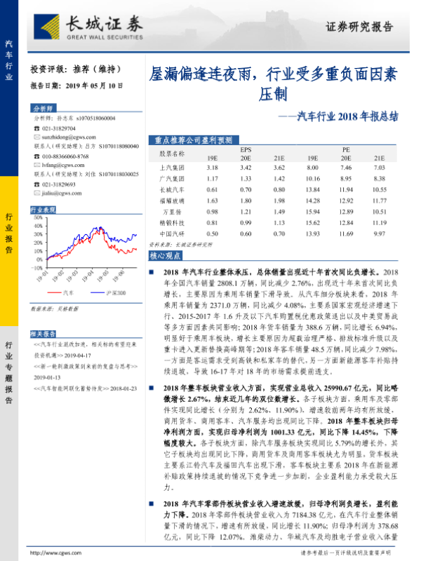 【长城证券】【20190510】汽车行业2018年报总结:屋漏偏逢连夜雨,行业受多重负面因素压制-40页