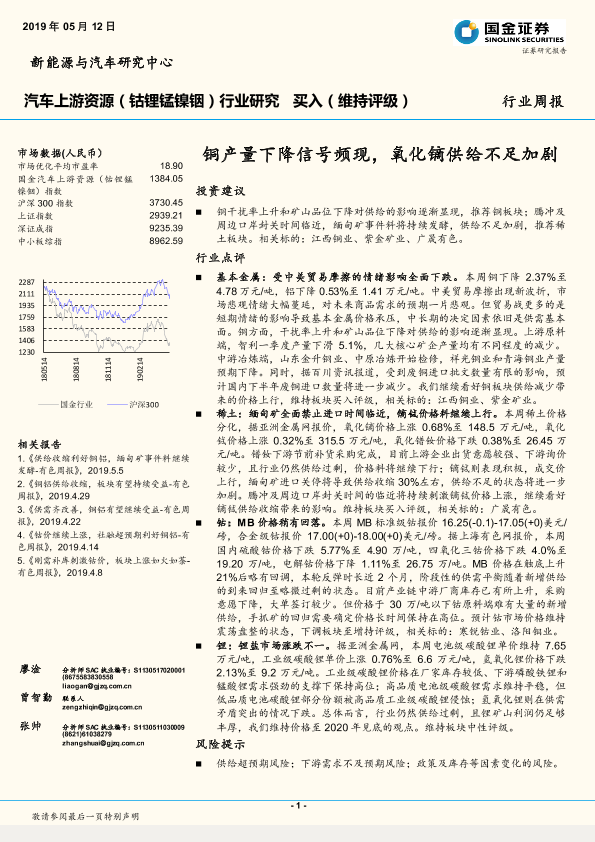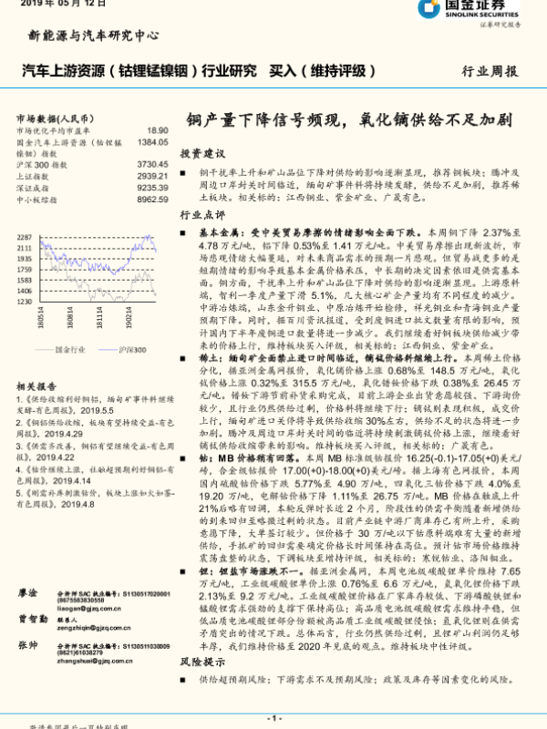 【国金证券】【20190512】汽车上游资源(钴锂锰镍铟)行业研究:铜产量下降信号频现,氧化镝供给不足加剧-8页