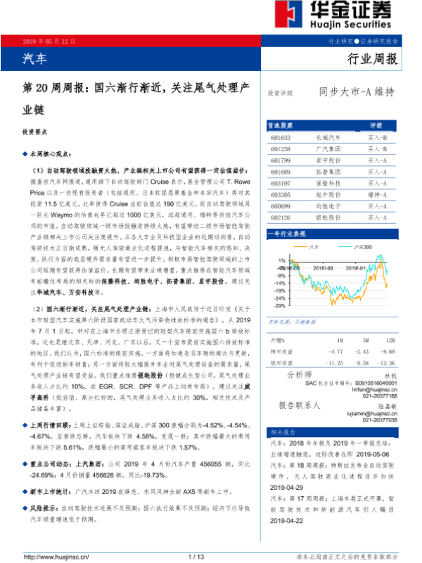 【华金证券】【20190512】汽车第20周周报:国六渐行渐近,关注尾气处理产业链-13页