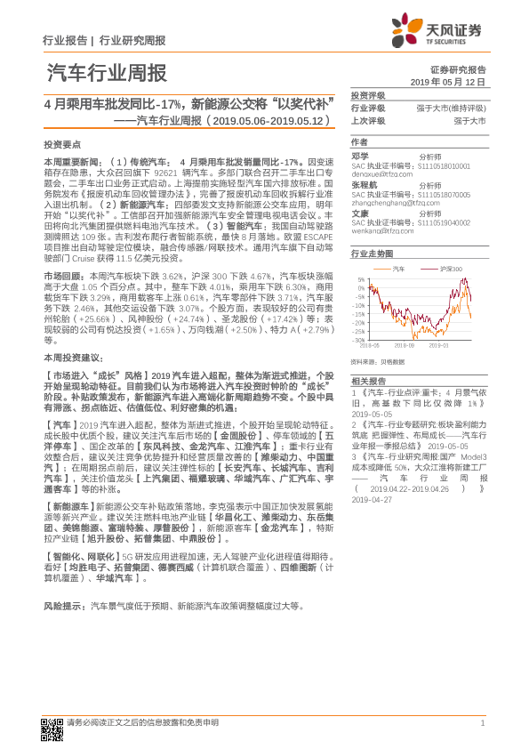 【天风证券】【20190512】20190512-天风证券-汽车行业周报:4月乘用车批发同比-17%,新能源公交将“以奖代补”-25页