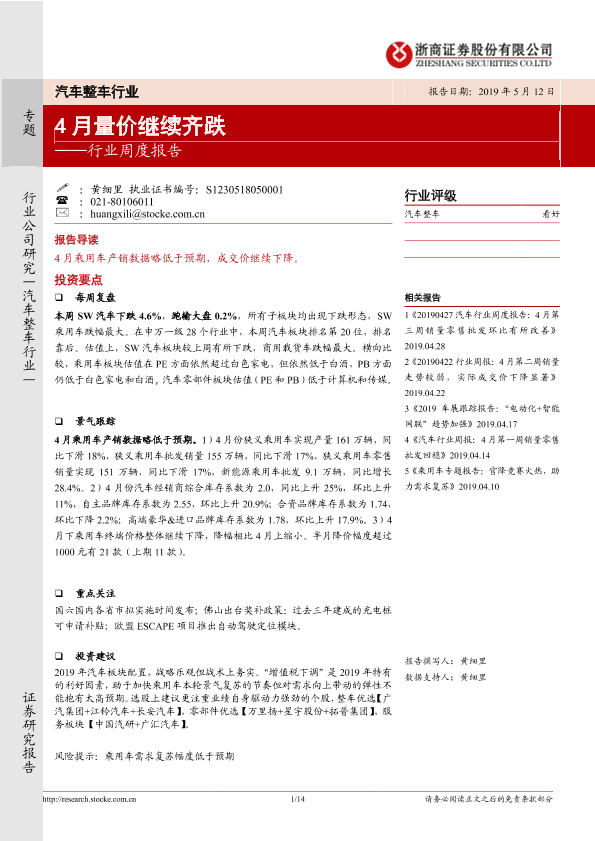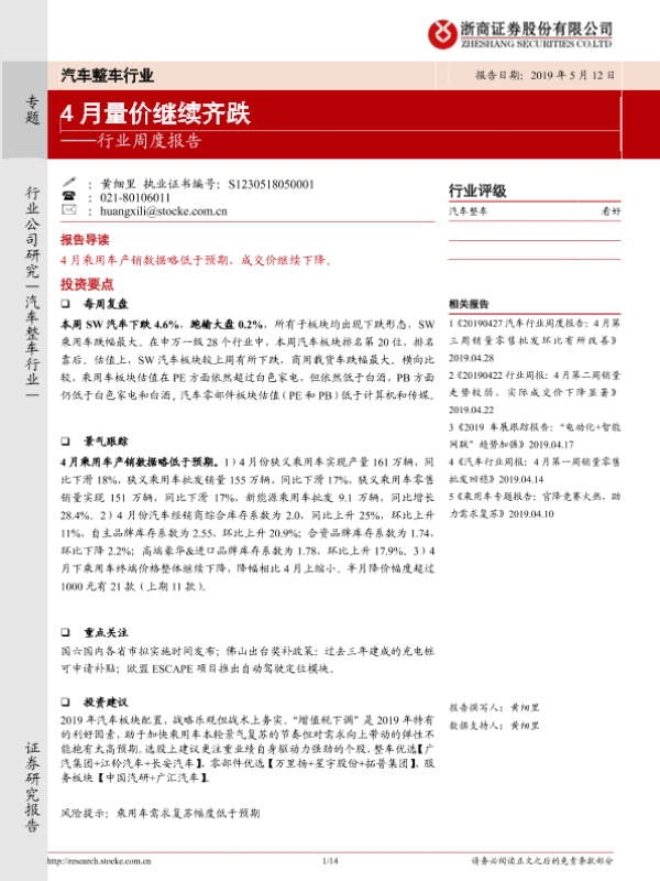 【浙商证券】【20190512】汽车整车行业:4月量价继续齐跌-14页