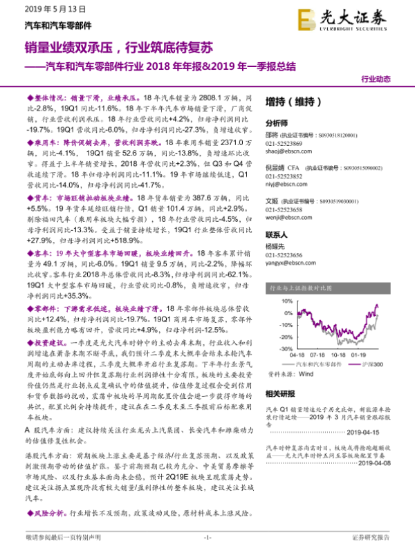 【光大证券】【20190513】汽车和汽车零部件行业2018年年报&2019年一季报总结:销量业绩双承压,行业筑底待复苏-23页