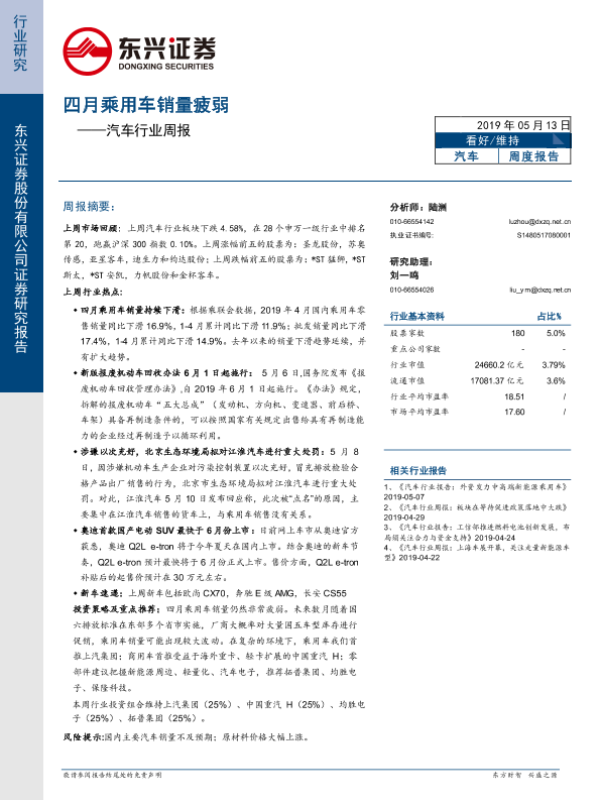 【东兴证券】【20190513】20190513-东兴证券-汽车行业周报:四月乘用车销量疲弱-18页