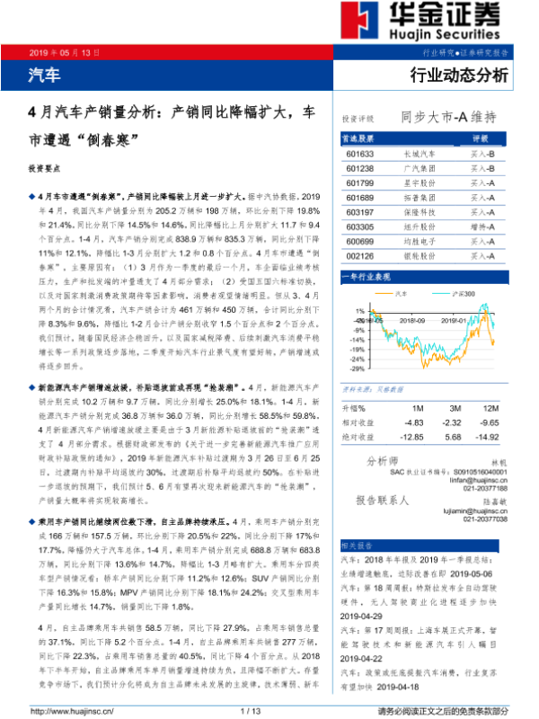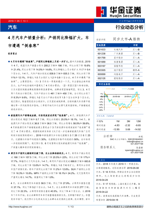 【华金证券】【20190513】4月汽车产销量分析:产销同比降幅扩大,车市遭遇“倒春寒”-13页