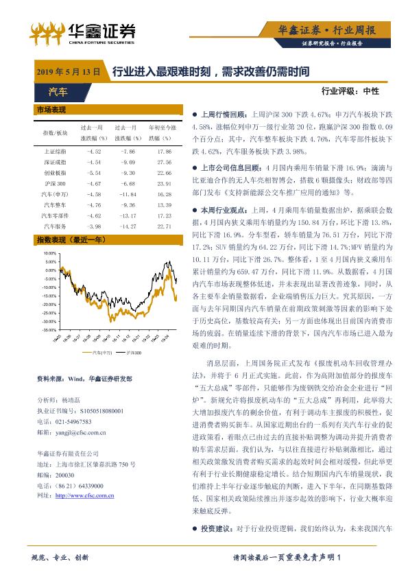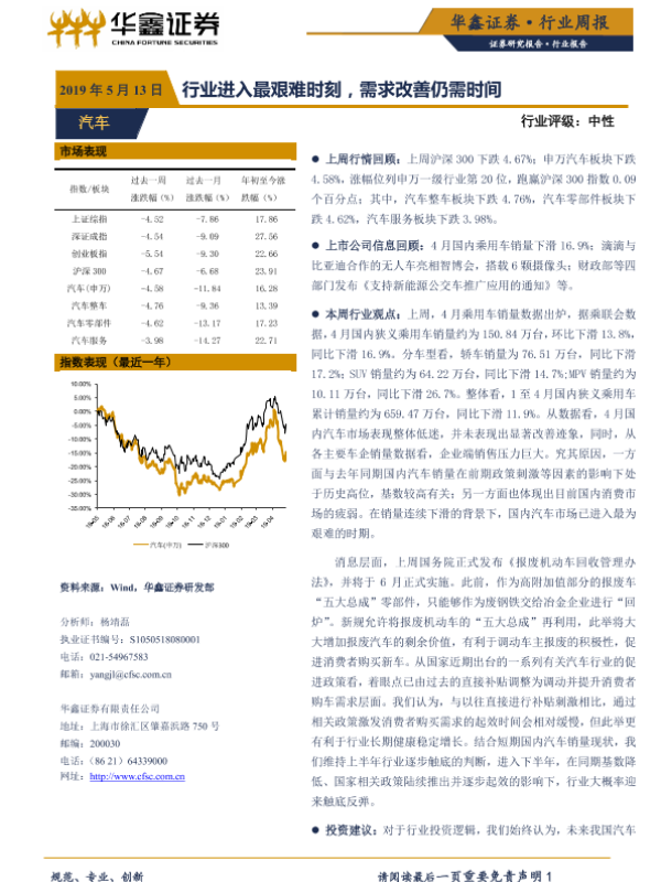 【华鑫证券】【20190513】20190513-华鑫证券-汽车行业周报:行业进入最艰难时刻,需求改善仍需时间-19页