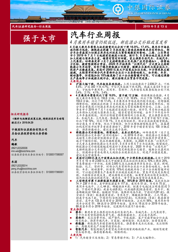 【中银证券】【20190513】20190513-中银证券-汽车行业周报:4月乘用车销量仍较低迷,新能源公交补贴政策发布-18页