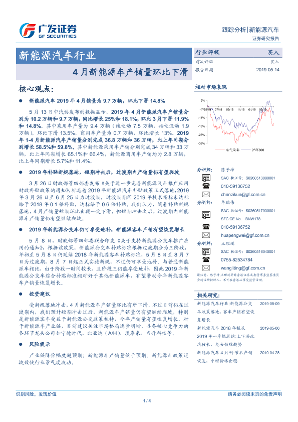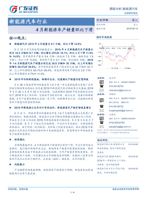 【广发证券】【20190514】4月新能源车产销量环比下滑:新能源汽车行业-4页