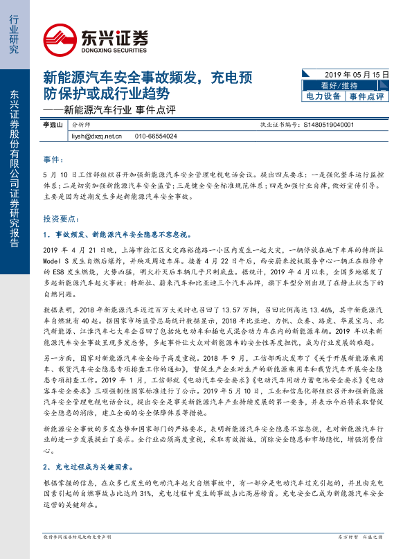 【东兴证券】【20190515】新能源汽车行业事件点评:新能源汽车安全事故频发,充电预防保护或成行业趋势-4页