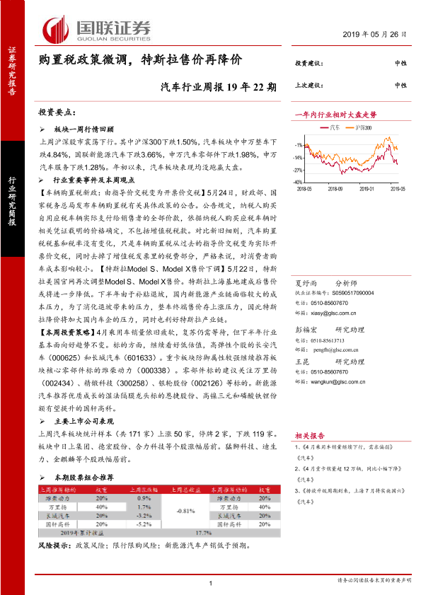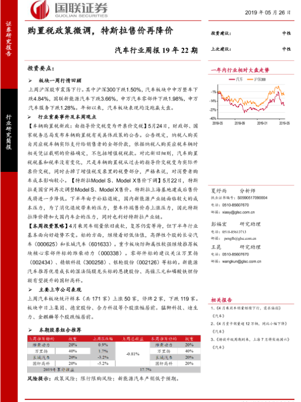【国联证券】【20190526】20190526-国联证券-汽车行业周报19年22期:购置税政策微调,特斯拉售价再降价-16页