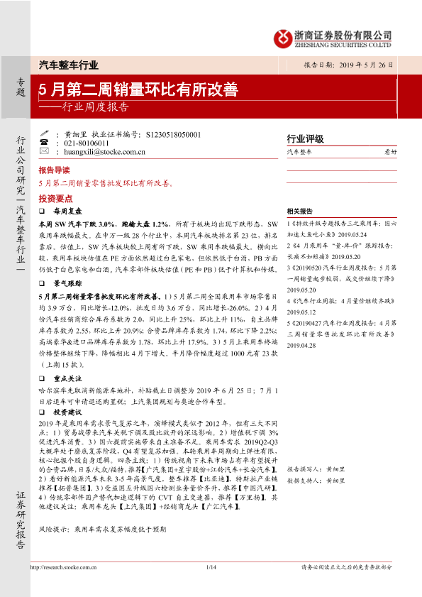 【浙商证券】【20190526】20190526-浙商证券-汽车整车行业周度报告:5月第二周销量环比有所改善-14页