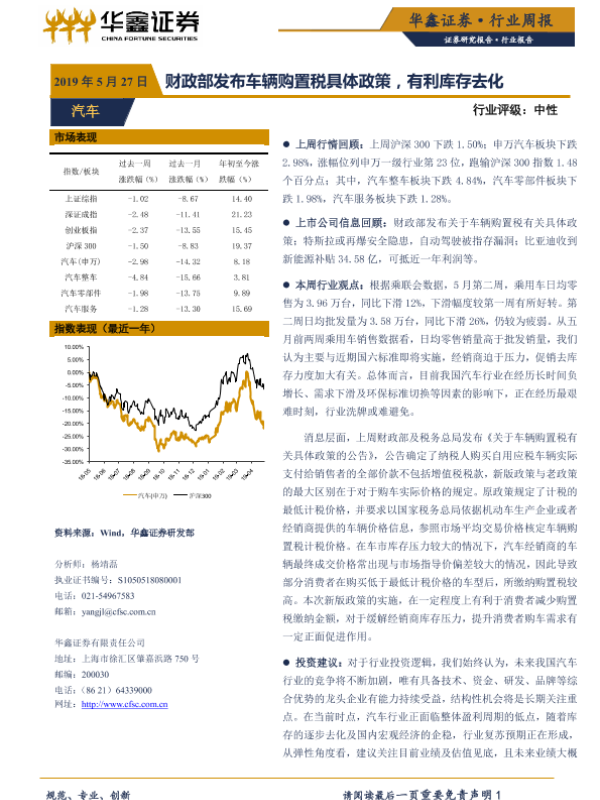 【华鑫证券】【20190527】20190527-华鑫证券-汽车行业周报:财政部发布车辆购置税具体政策,有利库存去化-19页