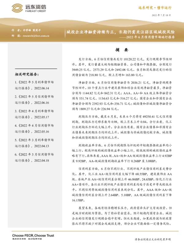 【远东资信】【20220718】2022年6月信用债市场运行报告:城投企业净融资持续为正,长期仍需关注弱区域城投风险-19页