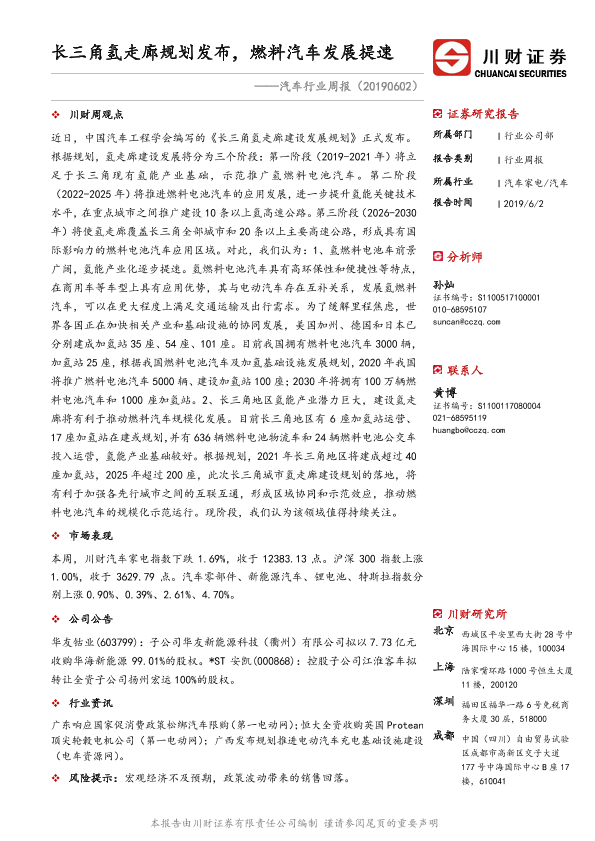 【川财证券】【20190602】汽车行业周报:长三角氢走廊规划发布,燃料汽车发展提速-10页
