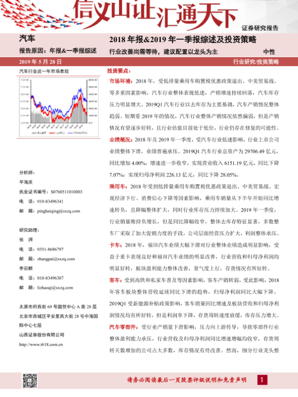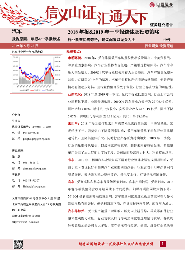 【山西证券】【20190528】汽车:2018年报&2019年一季报综述及投资策略:行业改善尚需等待,建议配置以龙头为主-30页