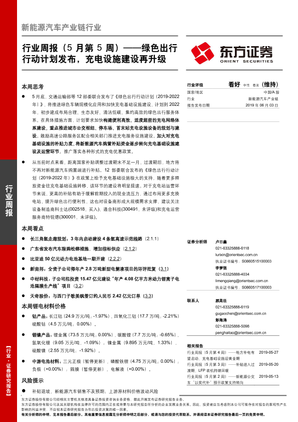 【东方证券】【20190603】20190603-东方证券-新能源汽车产业链行业周报(5月第5周):绿色出行行动计划发布,充电设施建设再升级-25页