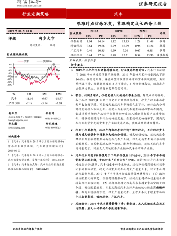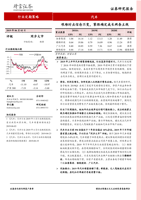 【财信证券】【20190603】20190603-财信证券-汽车行业定期策略:艰难时点信念不变,紧跟确定成长两条主线-27页