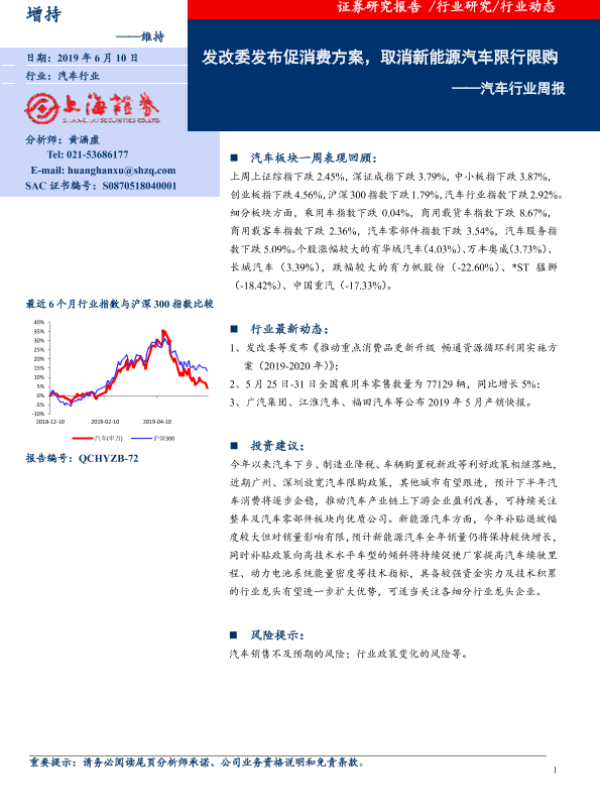 【上海证券】【20190610】汽车行业周报:发改委发布促消费方案,取消新能源汽车限行限购-7页