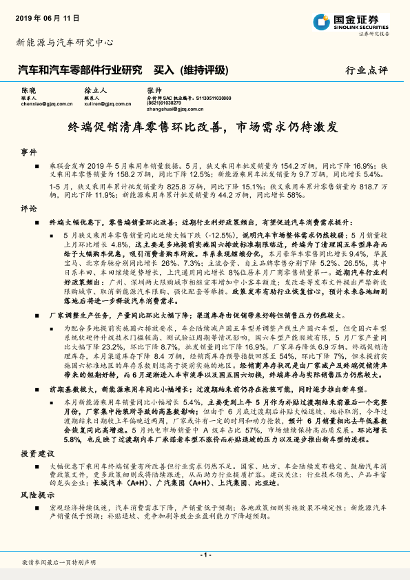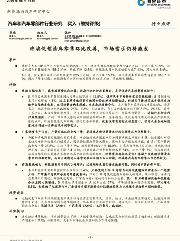 【国金证券】【20190611】汽车和汽车零部件行业研究:终端促销清库零售环比改善,市场需求仍待激发-4页