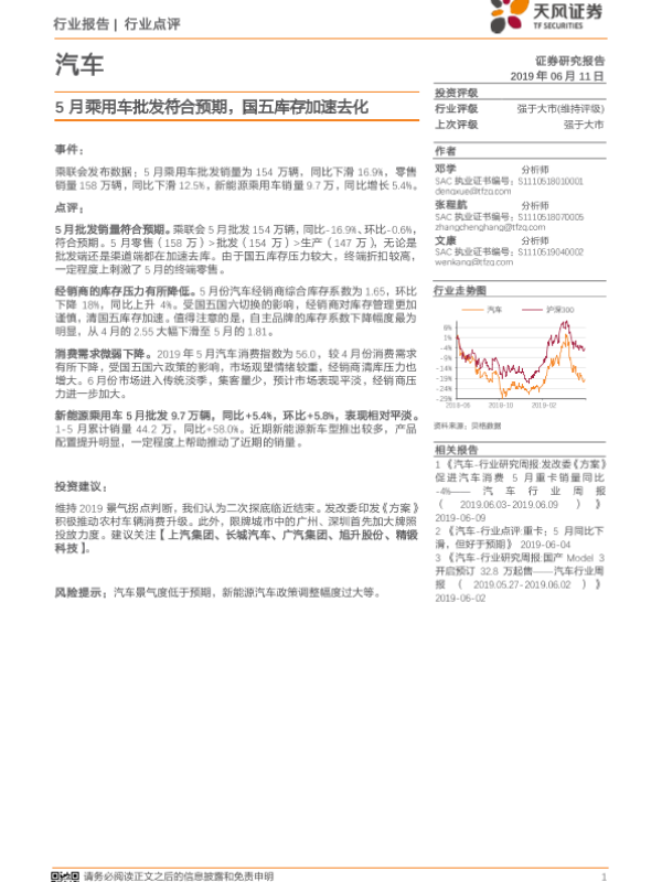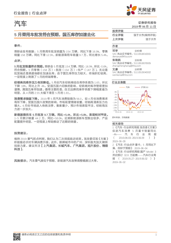 【天风证券】【20190611】20190611-天风证券-汽车行业点评:5月乘用车批发符合预期,国五库存加速去化-10页