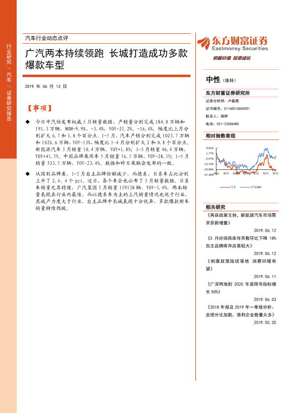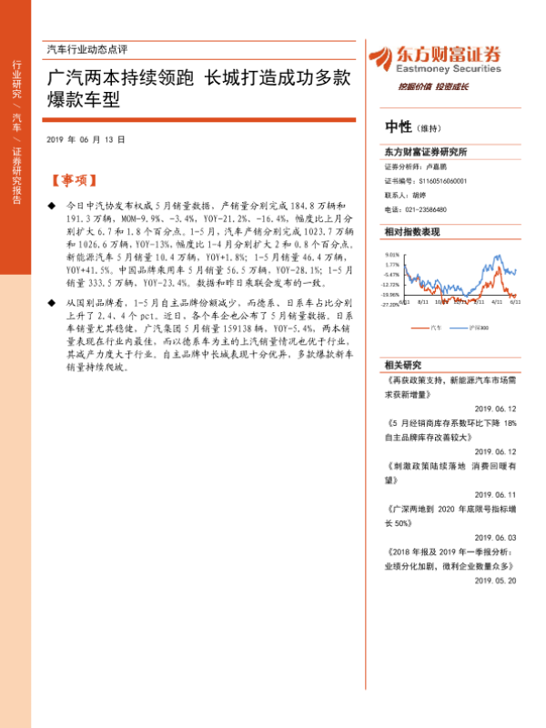 【东方财富证券】【20190613】汽车行业动态点评:广汽两本持续领跑 长城打造成功多款爆款车型-4页