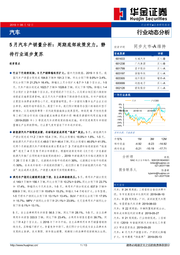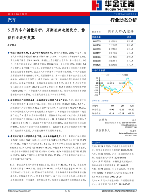 【华金证券】【20190612】5月汽车产销量分析:周期底部政策发力,静待行业逐步复苏-13页