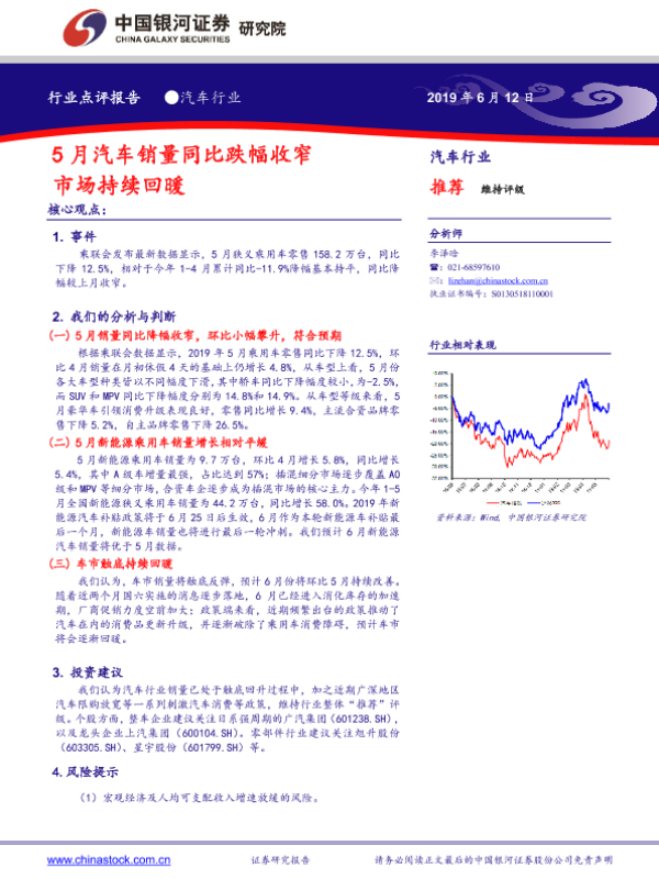 【银河证券】【20190612】汽车行业:5月汽车销量同比跌幅收窄 市场持续回暖-3页