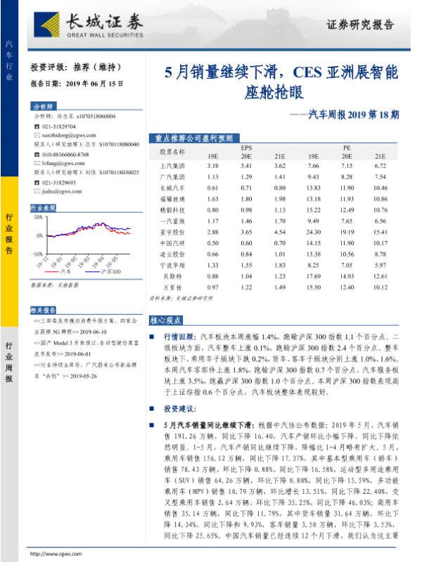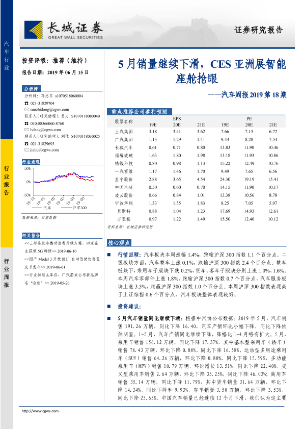 【长城证券】【20190615】汽车周报2019第18期:5月销量继续下滑,CES亚洲展智能座舱抢眼-13页
