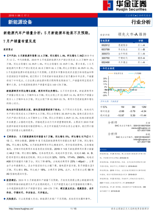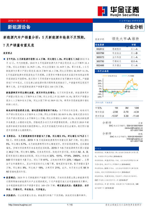 【华金证券】【20190617】新能源汽车产销量分析:5月新能源车抢装不及预期,7月产销量有望见底-15页