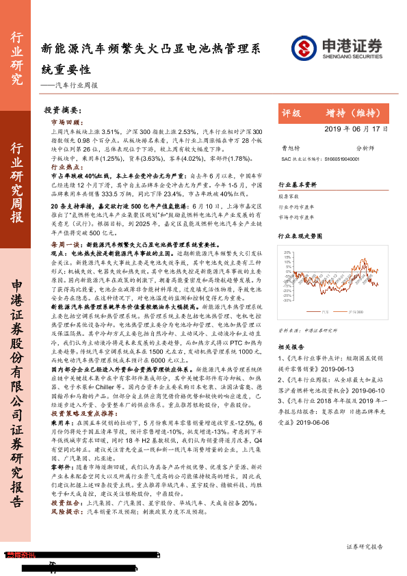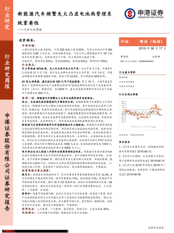 【申港证券】【20190617】20190617-申港证券-汽车行业周报:新能源汽车频繁失火凸显电池热管理系统重要性-22页