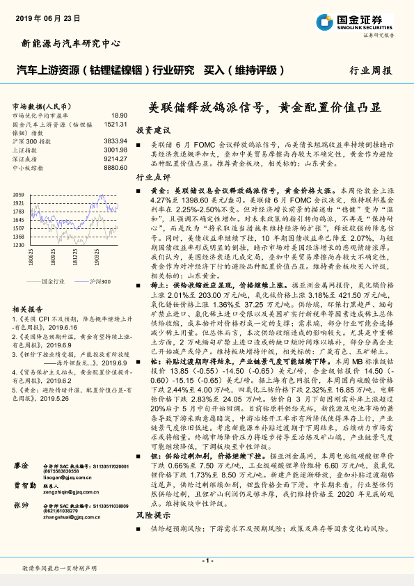 【国金证券】【20190623】20190623-国金证券-汽车上游资源行业周报:美联储释放鸽派信号,黄金配置价值凸显-8页