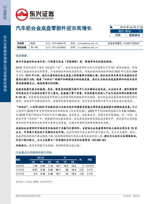 【东兴证券】【20190621】汽车深度报告:汽车铝合金底盘零部件逆市高增长-23页