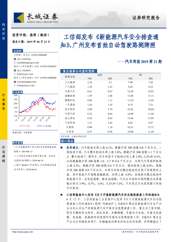 【长城证券】【20190623】汽车周报2019第21期:工信部发布《新能源汽车安全排查通知》,广州发布首批自动驾驶路测牌照-14页