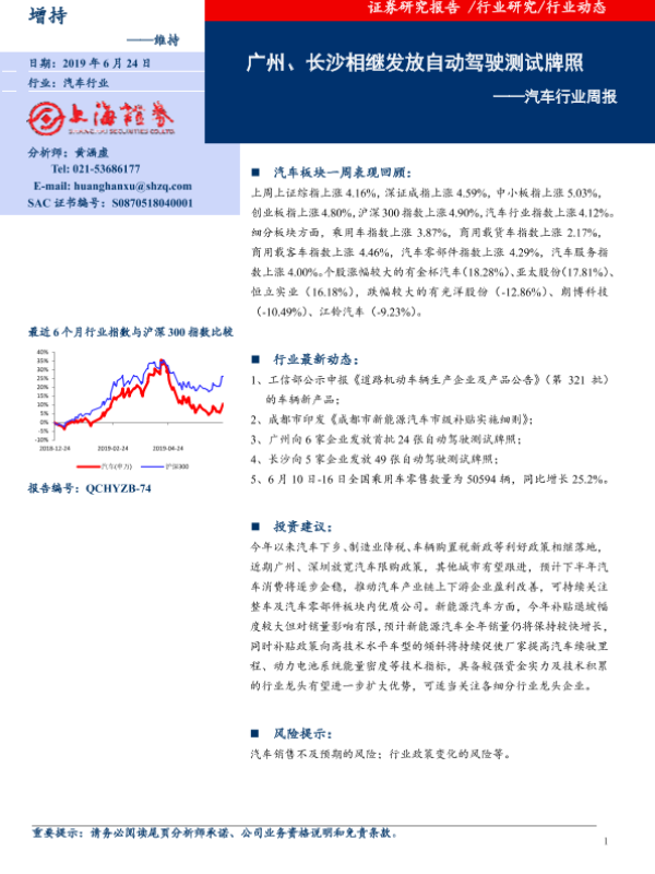 【上海证券】【20190624】20190624-上海证券-汽车行业周报:广州、长沙相继发放自动驾驶测试牌照-7页