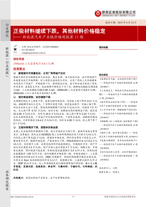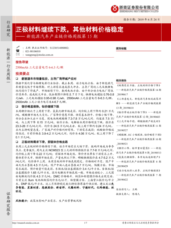 【浙商证券】【20190624】新能源汽车产业链价格周报第15期:正极材料继续下跌,其他材料价格稳定-7页